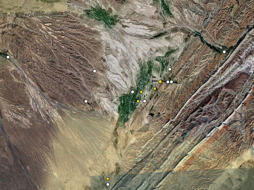 Accompanying our work at Tilla Bulak is an investigation of the settlement history of the Pashkurt plain. In connection with a geomorphological prospection of a 25 x were mapped, with sites datable from the Late Bronze Age until today. Of primary interest is the fact that our oldest finds from the region date to the early phase of the Sapalli Culture. They are thus contemporary with Tilla Bulak. It is still unclear where the people settling Southern Uzbekistan at the beginning of the 2nd millennium B.C. came from, but Turkmenistan and Northern Afghanistan are the most likely regions. | ||||